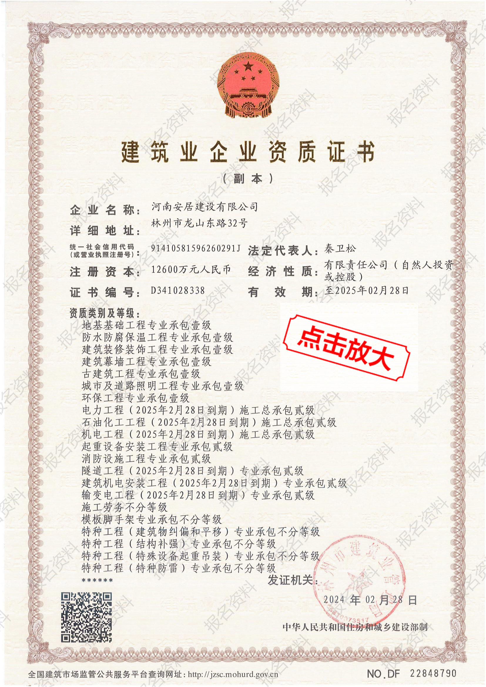 滔滔黃河哺育了中華民族拼搏向上的奮斗精神,巍巍太行造就了中原兒女的紅旗渠精神。百萬林州人下太行,鑄就了中國建筑之鄉(xiāng)響當(dāng)當(dāng)?shù)囊燮放啤:幽习簿咏ㄔO(shè)有限公司從誕生起血液里就流淌著紅色基因,秉承“安得廣夏千萬間,大庇天下寒士俱歡顏”的擔(dān)當(dāng)精神,用鋼筋混凝土筑起了高樓大廈,也用一流品質(zhì)、家國情懷打造了安居建設(shè)的輝煌成績。公司成立于2012年,注冊資金12600萬元,公司成立至今,擁有建筑,市政施工總承包等十項一級資質(zhì);其他二級等資質(zhì)共二十余項。公司秉承質(zhì)量第一,服務(wù)為主,堅持垂直管理,從不設(shè)立分公司等分支機(jī)構(gòu)。
